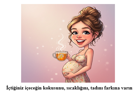 Günlük Farkındalık pratiklerini (informal mindfulnes uygulamaları) yaşamınızın her anında deneyimleyin. Her nefes alıp verdiğinizde ciğerlerinize dolan havayı fark edin. Yediğiniz yemeğin lezzetini, tadını (tuzlu mu?, Baharatlı mı? ) fark edin. İçtiğiniz içeceklerin (su, çay, kahve gibi) soğukluğunu, sıcaklığını, kokusunu, tadını, rengini fark edin. Yediğiniz elmanın tadını, kokusunu, rengini ve yerken çıkan sesi fark edin. Yıkayıp serdiğiniz çamaşırların yumuşaklığını/sertliğini, rengini, ıslaklığını, soğukluğunu/sıcaklığını, kokusunu fark edin. Yani dokunduğunuz objelerin yumuşaklığını, sertliğini, katılığını, renklerini, şeklini fark edin. Gebeliğiniz süresince memelerinizde, karın bölgenizde, yüzünüzde oluşabilecek değişimlere de odaklanarak bedeninizi fark edin.