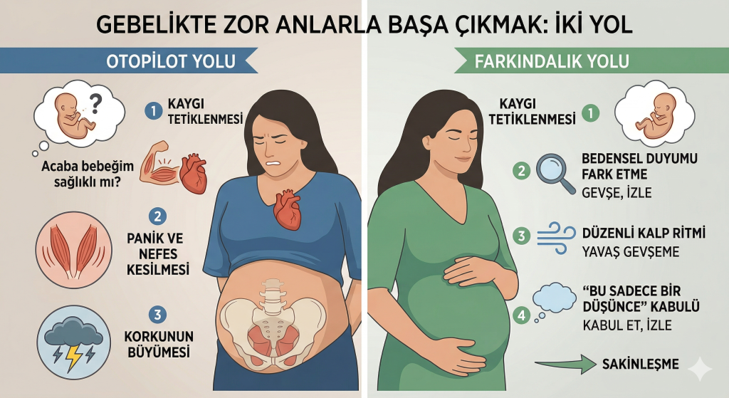 Gebelik sürecinde doktor kontrolü öncesi duyulan bir kaygı, ani bir mide bulantısı, yorgunluk veya zihne düşen “Acaba yapabilecek miyim?” düşüncesi gibi “hoş olmayan” bir olayla karşılaştığımızda, sistemimiz genellikle otopilota geçer ve “savaş, kaç veya donakal” tepkisi verir.